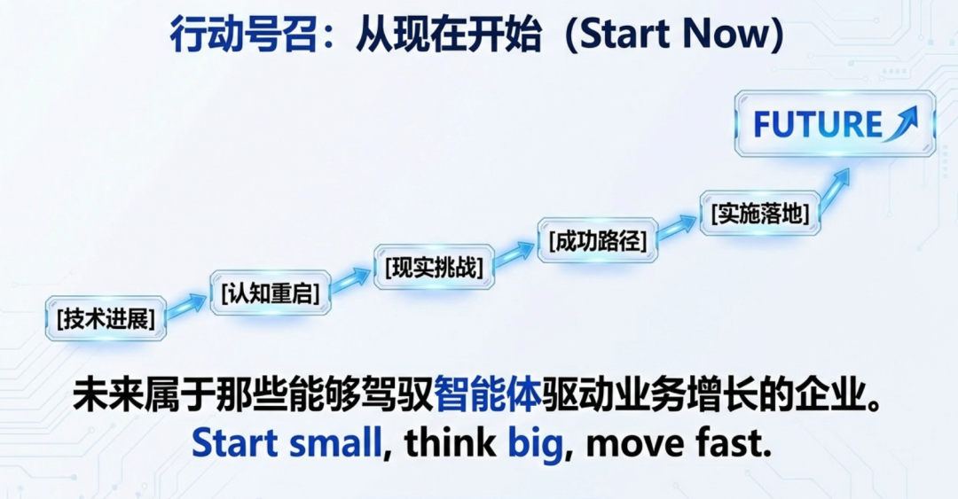 最终,企业将通过这种迭代向“前沿型企业”进化,迈向由人类设定方向、智能体自主运行业务流、人类仅在必要时干预的高级协同阶段。为了达成这一愿景,她建议企业应立即行动,开展全员AI培训,并制定AI快速验证计划。